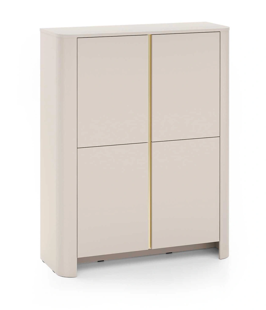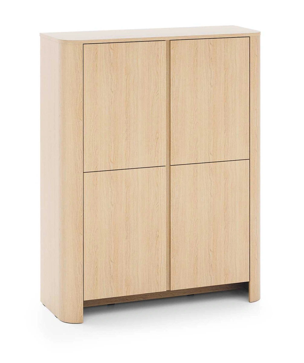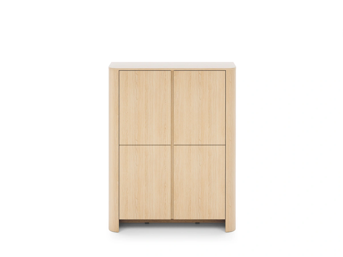 SOFT EDGE K103 to elegancka, wysmuklona komoda łącząca geometryczną formę z miękko zaoblonymi krawędziami. Dzięki układowi czterech szafek z półkami łatwo uporządkujesz zastawę, tekstylia, dokumenty i dodatki. Bezuchwytowy system podkreśla minimalistyczny charakter frontów, a jakościowe okucia Häfele gwarantują płynną, długotrwałą pracę. Neutralny kolor kaszmir lub naturalny dąb Vicenza pozwalają wkomponować mebel w nowoczesne aranżacje salonu, jadalni czy gabinetu.