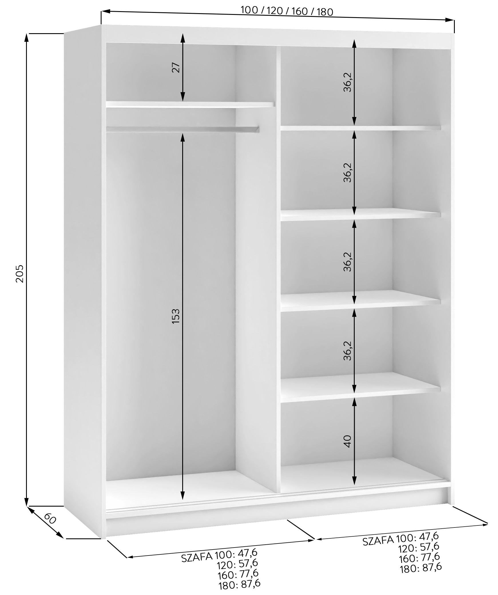 Szafa przesuwna Amera 100, 120, 160, 180 cm w klasycznym stylu w kolorze białym, czarnym, dąb artisan do sypialni, przedpokoju, garderoby