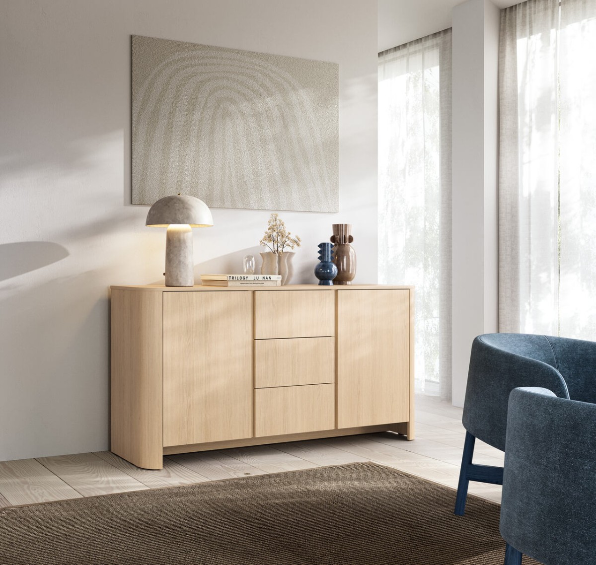 SOFT EDGE – Dąb Vicenza łączy geometryczną formę z miękko zaoblonymi krawędziami, tworząc elegancki, nowoczesny zestaw do salonu. Naturalny dekor dąb Vicenza ociepla przestrzeń i świetnie komponuje się z czernią, bielą i akcentami metalicznymi. Bezuchwytowy system podkreśla minimalistyczny charakter, a markowe okucia Häfele gwarantują płynność i trwałość użytkowania na co dzień.
